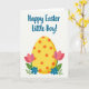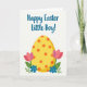 This design shows a bright spring illustration centered on a glowing yellow egg shape dotted with small orange circles and soft shading for depth. On both sides, rose-pink tulip-like flowers rise in matching curves, like they’re leaning in toward the center as if sharing a friendly moment 🌷. Near the base, clusters of rich blue blossoms sit among light and medium green leaves, giving the scene a fresh garden feel. Across the top, the greeting “Happy Easter Little Boy!” is placed in teal lettering, arcing gently above the egg. The letters are smooth and flowing, standing out clearly against the light background without crowding the artwork. Behind everything, a pale backdrop with a faint diagonal crosshatch pattern adds texture while keeping the focus on the flowers and egg 🐰. The composition stays symmetrical, with the pink blooms and blue flowers balanced evenly around the central yellow shape. Tiny green leaf sprigs and blue petals frame the lower edges beneath the egg, with the crosshatch lines barely visible in the negative space.