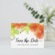 Handwritten script calligraphy and orange ethereal flowers floral fall wedding Save the Date postcard. The upper part is covered with pretty orange flowers and green leaves.