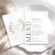 Enhance your timeless wedding celebration with an elegant botanican themed menu card. Showcasing a delicate wreath of orange meadow flowers and greenery leaves and simple minimalist olive green calligraphy script. This refined design is complemented by a personalized touch—the bride and groom names on the back, creating a memorable and distinctive element for your special autumn outdoor garden celebration.
