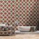 Vivid orange flowers on vertical blue, tan, and white pinstripes give this wallpaper a modern, stylish look.