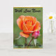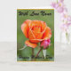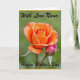Designed with a garden-inspired look, this card features a large, fully open flower in warm orange tones, with petals that fade gently into softer peach at the edges. Nestled close beside it is a small pink bud, leaning in as if sharing a quiet, affectionate moment ❤️. The background is a smooth, out-of-focus wash of leafy green that makes the two blooms stand out like they’re alone in a calm corner of nature. Near the top, a short line of text appears in a flowing, decorative style, set in a dark ink that contrasts clearly against the green. A second line of text sits along the bottom in the same style and color, balancing the layout without crowding the flowers. The lighting feels soft and sunlit, giving the petals a velvety depth and a gentle glow 🌼. The orange flower sits slightly left of center while the pink bud rests to its side, both sharply detailed against the blurred green backdrop.