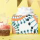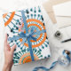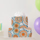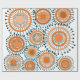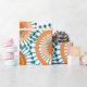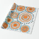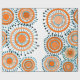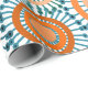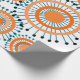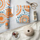This wrapping paper has a design of rings and circles in shades of orange with teal lines crossing behind them forming flowers on a field of white.