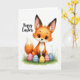 This design shows a stylized orange animal with oversized, shiny eyes looking straight out at you, as if sharing a quiet, friendly moment 🐰. Its fur is softly shaded, with a fluffy white chest, a white-tipped tail, and tall ears finished with dark tips. The character sits calmly in a small patch of green grass, leaning slightly forward in a gentle, welcoming pose. Nestled around it are several decorated oval eggs in pale pink, light blue, and soft yellow, each patterned with thin stripes, dotted spots, and zigzag lines. The open white background keeps the scene airy and lets the warm orange and spring colors stand out without distraction 🌷. In the upper left corner, a short Easter greeting appears in flowing black lettering, placed with plenty of space around it. A faint rosy blush warms the character’s cheeks, and the eggs rest among the grass blades with tiny highlights that make their patterns easy to see.