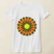 An orange geometric flower mandala motif variated with black with a green outline and a yellow center.