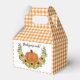Adorable rustic autumn favor boxes printed with an orange gingham pattern and an illustration of a plump little pumpkin with a wreath of sunflowers and mint green and yellow flowers and greenery twigs with orange berries. Thank the guests at your autumn baby shower, autumn wedding, autumn bridal shower, autumn birthday party or any other fall event with a pumpkin theme with these pretty pumpkin favor boxes with sunflowers and a touch of country charm with the printed gingham pattern.