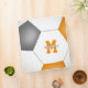 This soccer themed 3 ring binder features the image of a simple, abstractly oversized soccer ball that has orange, gray and white panels - athlete's name and monogram, varsity letter, or jersey number are customizable, as is the text on the spine of the binder and the color of the spine - by katz_d_zynes