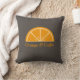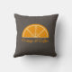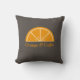A brown pillow with an orange half-slice and customizable text underneath. It could be used when for your home decoration or as a gift to a citrus lover!