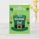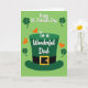This greeting card features a large leprechaun top hat in deep emerald green filling the lower two-thirds of the scene, with a black band and a gold buckle that looks lightly lit. Across the hat, the words “To a Wonderful Dad” appear in soft white lettering with a gentle shadow, as if nestled into the curve of the brim. Behind it all sits a bright chartreuse background that keeps the St. Patrick’s Day theme front and center ☘️. Darker green four-leaf clovers are placed around the design in a balanced way, giving the layout a steady, cared-for look. Three orange hearts add a warm, close-to-home touch, like a quiet hug tucked into the holiday decor 💚. Near the top, “Happy St. Patrick’s Day” is written in matching white lettering, with small shamrocks set to either side to frame the greeting. The hat’s buckle sits centered and rectangular, with crisp edges and a golden shine against the black band.