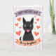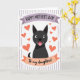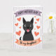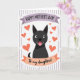 This card features a simple illustration of a black dog centered on the front, smiling with a small pink tongue peeking out and wide, friendly eyes that feel like a warm look shared between family ❤️. Above the dog, a lavender banner stretches across the top with “HAPPY MOTHER’S DAY!” in dark lettering that stands out clearly. Below, an apricot-colored banner carries the words “To my daughters!” in darker text, like a gentle note tucked into the design. Around the dog, many orange hearts float in different sizes, creating the sense of affectionate attention circling close. The hearts are scattered loosely, giving the scene an airy, light touch while still feeling close and caring 🌼. Behind everything, the background stays soft with faint vertical lines, adding texture without pulling focus. The overall palette mixes lavender, apricot, orange, black, and pink, with the hearts clustered around the dog’s head and shoulders. The dog’s face sits centered between the two banners, framed by the surrounding orange hearts against the subtly lined background.