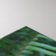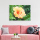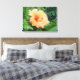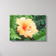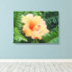 The artwork on this Canvas Print is an original photograph by HomeWare of an orange hibiscus flower. In the photo, we see the flower peeking out from among some green fern fronds in a lovely garden. The flower is in full bloom, with its ruffled edges standing out from the background of ferns. The shape of the flower is like a trumpet, curving outward, with red dots on top of yellow stems in the center of the bloom. The photo is a closeup showing the detail in the flower petals of this peach colored beauty.