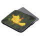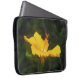 The original photograph by MaeFlowers on this 15” Laptop Sleeve features a bright yellow orange hibiscus flower in full bloom against a natural dark green background. The flower petals have a ruffled edge, and the stamen ends in five tiny red spheres. A shiny green leaf of the hibiscus can be seen below the flower. Brighten your day with this flower photo, a tropical garden beauty!