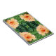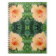 The original pattern on this Notebook was made from an original photograph by HomeWare. The orange hibiscus flower we see in the photo is peeking out from among some green fern fronds in a lovely garden. The flower is in full bloom, with its ruffled edges standing out from the background of ferns. The shape of the flower is like a trumpet, curving outward, with red dots on top of yellow stems in the center of the bloom. The photo is a closeup showing the detail in the flower petals of this peach colored beauty.