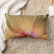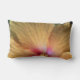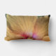 The original photograph by MaeFlowers on this Lumbar Pillow is a closeup of an orange hibiscus flower. The flower petals are a yellow orange color, turning pink into deep red at the flower's center. We can see the details of nature's pollen system, soft red dots and tiny yellow florets. The veins in the petals can be seen spreading outward their ruffled edges. A bit of leafy green background sets off the ruffles.