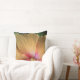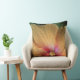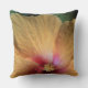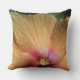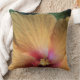 The original photograph by MaeFlowers on this 20” Throw Pillow is a closeup of an orange hibiscus flower. The flower petals are a yellow orange color, turning pink into deep red at the flower's center. We can see the details of nature's pollen system, soft red dots and tiny yellow florets. The veins in the petals can be seen spreading outward their ruffled edges. A bit of leafy green background sets off the ruffles.