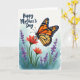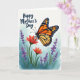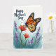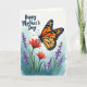 This card features a large flying insect centered in the scene, hovering with an almost affectionate stillness, as if pausing to admire the garden below ❤️. Its wide wings are patterned in bright orange and deep yellow sections, traced with dark veins and edged in dark borders dotted with small white spots. Below, two red-orange flowers open toward one another like close friends leaning in, each showing a tiny yellow center. Slender green stems rise around them, sprinkled with small purple blossoms that add a gentle, springtime rhythm. The background is a soft wash of muted blue-green, giving the whole setting an airy, calm feel with lots of breathing room. In the upper left, a short message appears in a flowing, cursive-style font in a dark tone that stands out clearly against the pale backdrop 🌼. Fine details show in the insect’s antennae and legs, and the petals have light shading that makes them look softly layered against the blue-green wash.