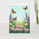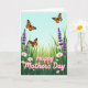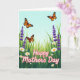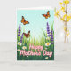 Designed with a sunny meadow scene, this card shows a pale blue sky stretching above three winged insects with orange-and-black markings drifting as if circling one another in a gentle, affectionate dance ❤️. Below them, layered green grass spreads across the page with small shifts in shade and height that give it a soft, natural depth. Tall purple flower spikes rise here and there like neat little bouquets tucked into the field, adding a calm contrast to the greens. White daisy-like blooms with warm yellow centers dot the meadow in different sizes, like scattered notes that keep the scene feeling lively and friendly 🌼. The words “Happy Mother’s Day” sit prominently in the foreground, set in flowing pink lettering with a thin white outline so they stand out against the plants. The text feels nestled into the flowers rather than floating above them, as if the message is being offered from the garden itself. Bright, diffused light washes over the whole illustration, and the orange wings, purple blossoms, and white petals are clearly defined against the sky and grass.