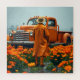 The color orange is the primary color, with an orange truck, orange flowers and orange clothes.