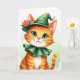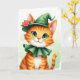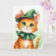 Designed with an orange tabby kitten centered in the scene, this St. Patrick’s Day card features big emerald-green eyes that catch the light with a tender, inviting gaze 💚. The kitten’s soft smile, pink nose, and fine whiskers give it the kind of gentle charm that feels like a quiet inside joke shared with a close friend. It wears a deep forest-green outfit with a pointed hat that bends slightly to one side, topped with a red-orange flower and green leaves for a sweet, affectionate touch ☘️. A matching ruffled collar circles its neck, edged with a thin golden line that frames the fluffy white chest like a little dress-up moment. The orange stripes of its fur glow warmly against the cooler greens, creating a cozy contrast that draws you in. “Happy St. Patrick’s Day” appears near the top in green lettering, with a smaller line of greeting text in gold set beneath it. The background is a pale green wash with soft, diffused lighting, and the kitten’s glossy eyes and carefully textured fur stand out in crisp detail for sharing St. Patrick’s Day sentiments.