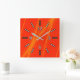 This square clock design features an abstract pattern consisting of somewhat blurry orange lines on a red background. The orange lines could be considered to resemble the appearance of laser beams. It also features rectangles marking the hours, and numbers indicating the hours "12", "3", "6", and "9".
