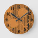 This wall clock has a mid-century modern design of black vertical lines with circles scattered on top on a field of orange.
