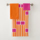 This towel set has a pink washcloth, an orange hand towel, and a bath towel with a mid-century modern design of orange vertical lines with pink rectangles above, repeated over the design.