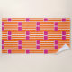 This beach towel has a mid-century modern design of orange vertical lines with pink rectangles above, repeated over the design.