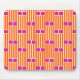 This mouse pad has a mid-century modern design of orange vertical lines with pink rectangles above repeated over the design.