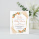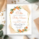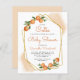 This citrus themed baby shower invitation features a gold geometric frame adorned with watercolor oranges. The customizable text is in modern orange handwriting script and black sans serif. Personalize it with the name of the mom-to-be and shower details. The back of the card is a pastel shade of orange matching the watercolor highlights on the front. Ideal for a summer baby shower!