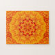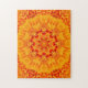 A photo of a perfect orange flower marigold transformed into a vibrant orange mandala designed puzzle.