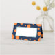 Orange and navy blue polka dot birthday party place card with a mint green accent.