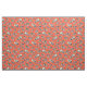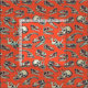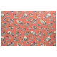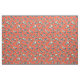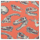 This fabric has hand-illustrated dinosaur skulls in navy blue and cream on a bright red-orange background.