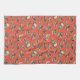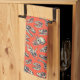 This kitchen towel features hand-illustrated dinosaur skulls in navy blue and cream on a bright red-orange background.