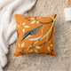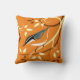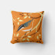 Decorative pillows with stylized bird art of a Nuthatch on branch swirls and an orange background with leaf pattern
