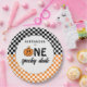 Orange One Spooky Dude Personalized Halloween 1st Birthday Party Paper Plates - Celebrate your little dude's big one in a spooky and fun way this Halloween season with this cute orange and black checkerboard retro smiley face pumpkin 1st Boo-Day Party theme for boys. Featuring black and white checkerboard and orange and white checkerboard, classic Halloween colors. A smiley face pumpkin with lightning eyes adds to the fun, retro spooky season aesthetic. Elevate your party decor with personalized birthday paper plates! All text is editable.