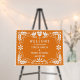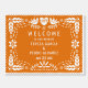 Orange Papel Picado lovebirds wedding fiesta welcome foam board sign displaying two white lovebirds and a love heart with the word love and flowers, leaves and small dots on orange background.