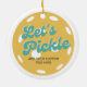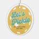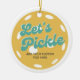 A fun pickleball ornament featuring an orange pickleball, "Let's Pickle" in a fun retro font and your custom text. Add a player name, pickleball club name, funny saying, etc. Makes a perfect pickleball party favor or holiday christmas gift.