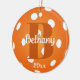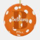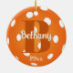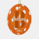 Personalized orange pickleball ornament with monogram, name and year for the pickleball enthusiast. The sample is shown on a round ceramic ornament--other ornament styles are available on the ordering page or the design can be transferred to other ornament styles or another product. ASSISTANCE: For help with design modification or personalization, color change, resizing, transferring the design to another product or you would like coordinating items, contact the designer BEFORE ORDERING via the Zazzle Chat MESSAGE tab below or email makeitaboutyoustore@gmail.com.