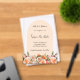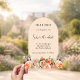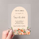 For an elegant and romantic wedding. A clear, transparent background decorated with orange, peach and pink florals. Arch shaped frame. Personalize and add your date, names and details.
