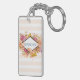 Monogram keychain with a peach and white striped pattern. Layered over top is an orange and pink floral arrangement with green leaves. A diamond shaped frame layered over top with your personalized text inside. On the back you can put your name inside the diamond shaped frame.