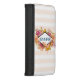 A phone case wallet with a peach and white striped pattern. Layered over top is an orange and pink floral arrangement with green leaves. A diamond shaped frame layered over top with your personalized text inside.