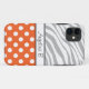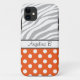 Custom iPhone 5 case personalized with your name, and designed with an orange & white polka dot pattern and a faded zebra print pattern with gray & white zebra stripes.