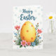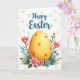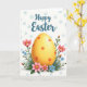 This greeting card features a large decorated egg centered on a white background, shaded from sunny yellow into warm orange with a glossy highlight that makes it look freshly painted. Crimson-orange polka dots scatter across the egg, adding a flirty, lighthearted touch like a shared joke between close friends 🐰. At the base, a garden-like cluster of greenery and flowers gathers close, with pink blooms and yellow centers nestled beside small soft-blue blossoms for contrast 🌷. Slender stems, rounded leaves, and a few unopened buds lean toward one another, creating the look of a gentle embrace. Near the top, a celebratory message sits in smooth teal lettering, spaced above the egg so it feels airy and balanced. The background is sprinkled with tiny pale-blue dots that echo the egg’s pattern without stealing attention. Soft lighting casts mild shadows under the egg and along the leaves, while the teal text hovers above the warm gradient and the pale-blue dots drift behind it.