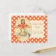 Whimsical retro wedding save the date postcard done in an orange and white polka dot pattern, with graphic of a retro woman cooking. Personalize the text for a fun and economical way to announce your wedding plans.