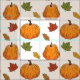 Destei's cartoon illustrated pattern of autumn harvest time including orange pumpkins and some colorful fall leaves.