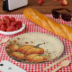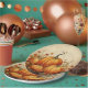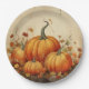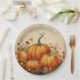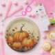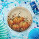 Paper plates with a rustic illustration with orange pumpkins and fall leaves. An autumn grunge vibe.
