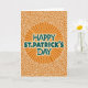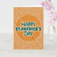 This greeting card centers on a bright orange circle like a stylized sun, with straight rays shooting outward to set a lively St. Patrick’s Day scene. Inside that circle, the words “HAPPY ST. PATRICK’S DAY” sit across three lines in teal green letters, edged with a thin white glow that helps them stand out. The warm orange tones feel like an open invitation, while the cool green type adds that classic holiday nod 💚. Around the center, a deeper orange background is filled with fine white swirls that echo Celtic knotwork, giving the design a close, intertwined feel, like friends leaning in for a photo ☘️. The mix of sharp rays and curling lines creates a push-and-pull that reads like cheerful energy meeting gentle connection. The message stays firmly in the middle, framed by the rays so your eyes land on the greeting first and then wander outward. Behind it all, the white linework forms looping, lace-like patterns across the orange field.