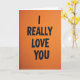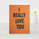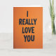 This card features the words “I REALLY LOVE YOU” stacked in the center in dark blue lettering on a bright orange background. The letters look slightly uneven and textured, like they were printed with ink that leaves a bit of grain around the edges. The message is easy to read, with simple, chunky letter shapes that feel direct and honest. The orange backdrop fills the whole front and has a faint speckled look, which gives it a warm, lived-in feel. There are no characters or extra objects—just the strong color contrast and the big message doing all the talking. It feels meaningful because it doesn’t hide behind jokes or extra details; it just says what you want someone to know ❤️. This is a sweet choice for a partner or a close friend when you want your feelings to come through clearly 🥰. Hope it helps you share your Valentine’s Day sentiments.