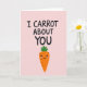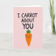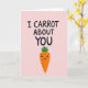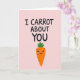 This card features a soft pastel pink background with a tender, friendly mood 🌷. Near the top, the phrase “I CARROT ABOUT YOU” appears in dark lettering, centered and easy to read. Just below the words, an orange root vegetable character stands upright like a little companion, adding a sweet, affectionate tone 🐰. It has a bright green leafy top, small black dot eyes, and a wide curved smile that feels like it’s directed at someone special. Light pink blush marks on its cheeks suggest a shy, caring connection, as if it’s quietly admitting fondness. The orange body shows a few short horizontal lines to hint at natural texture while keeping the drawing simple. The composition is balanced with the text above and the character beneath, all set against the smooth pink field with no other objects in the scene.