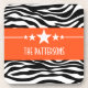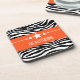 Trendy and modern Sassy Star Zebra Coaster Set featuring a chic black and white zebra print background and a bold orange border adorned with a fun star motif. This girly design may be customized with the personalized text of your choosing. Click "Customize It" to find more personalization options.