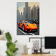 Orange sports cars driving on a road with a city in the background. This is a AI generated art.